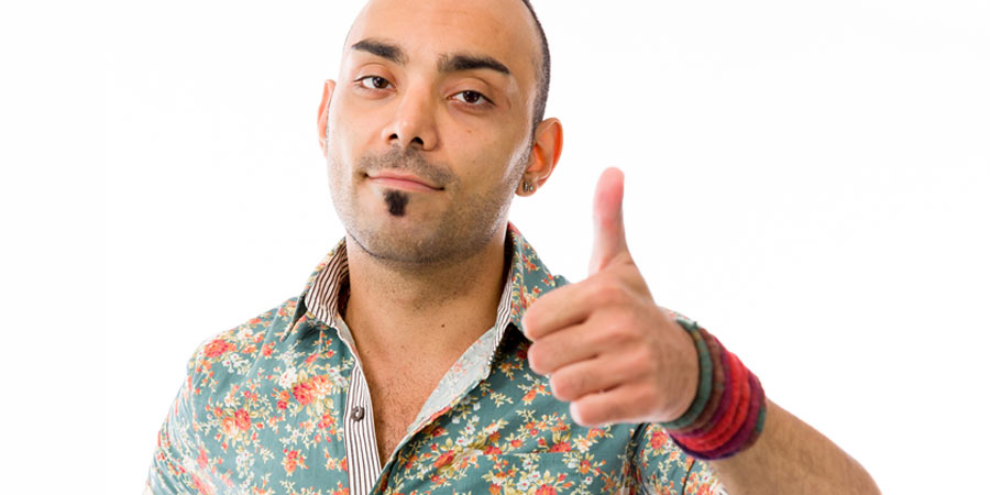 Gay man wearing a colourful shirt giving a thumbs up sign after coming out to family & friends